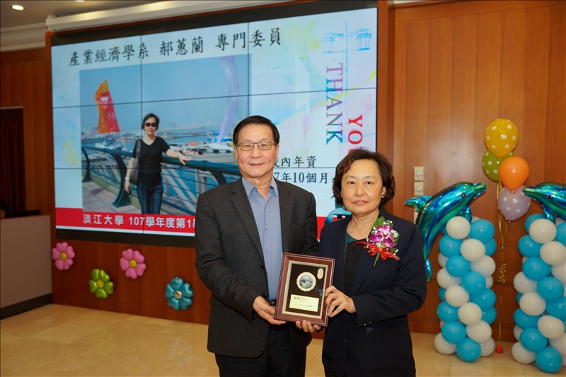 107學年度第1學期榮退茶會,葛煥昭校長(左)致贈感謝牌給退休同仁郝蕙蘭專門委員(右)。