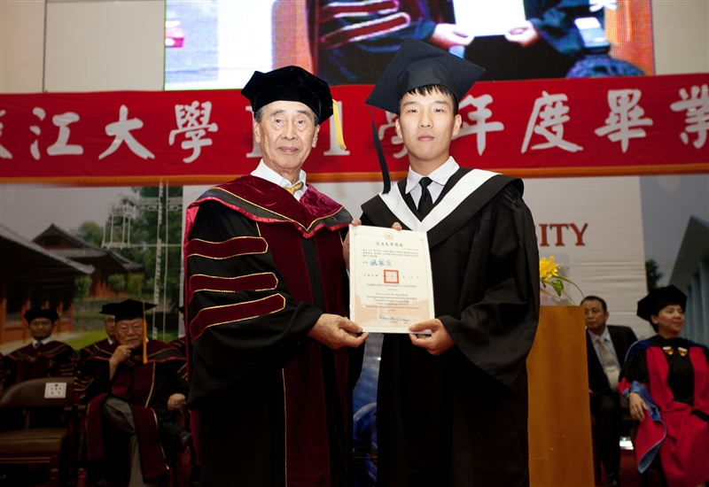 畢業典禮首先由張校長致詞,張校長表示:「三環五育」與「三化」是學校最重要的教育理念理念,並以培育具有「全球視野」、「資訊運用」、「洞悉未來」、「品德倫理」、「獨立思考」、「樂活健康」、「團隊合作」及「美學涵養」等八大基本素養的畢業生為目標。張校長特別表揚建築系的應屆畢業生李承翰同學,3年前他遠赴柬埔寨幫貧村重建教室,去年到台東幫偏鄉小校翻修老舊教室,更在畢業前夕協助93歲陳阿嬤修繕破舊「土角厝」,解決居住危險的問題,不僅發揮所學並實踐了淨心淨境的推己及人,也彰顯了「德不孤,必有鄰」的公平正義。此外,管科所校友徐航健響應本校將籌建國際會議中心,特別捐贈1.2億元,不僅支持學校的興學理念,更為學校增添了邁向國際頂尖大學的利器。張校長進一步表示:這兩位淡江人的身體力行也為淡江品德年做了最完美的詮釋,這也正符合了本校揭櫫的使命—「塑造社會新文化,培育具心靈卓越的人才」,學子們在追求專業知識與通識核心課程的同時,更要注重品德的陶冶,在踏入社會後,才能夠發揮術德兼備、用為世匡,進而燭照社會人類。