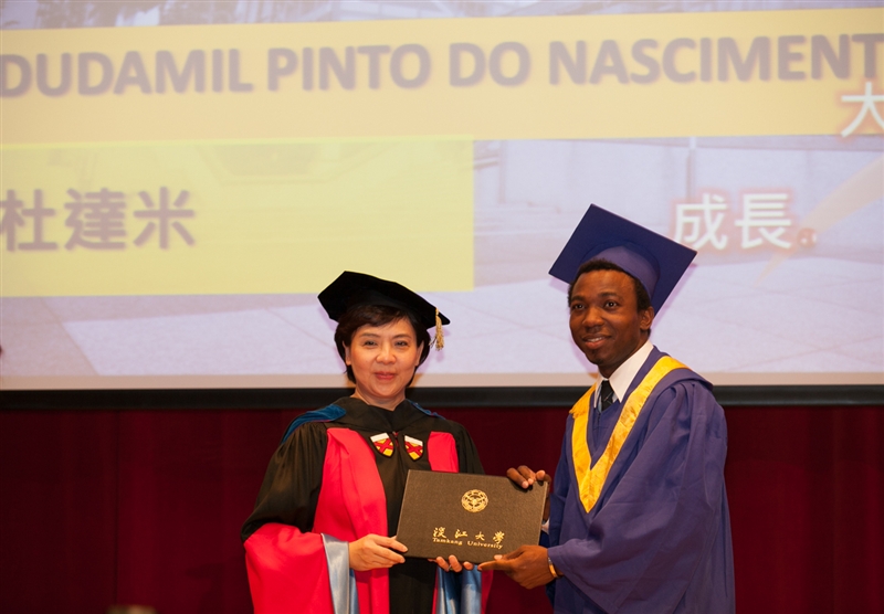 蘭陽校園90%以上的課程採英語授課,各屆畢業典禮皆全程以英語進行,畢業典禮由張校長主持,蒞臨的貴賓有:馬紹爾群島共和國菲利浦.卡布亞(Phillip Kabua)大使暨夫人、參議員Jeban Riklon,宜蘭縣政府計畫處周慶安處長代表縣長出席,礁溪鄉長林錫忠先生等。張校長以「有品有德.淡江了得」期勉畢業同學需具備:品德倫理、獨立思考、樂活健康、團隊合作、美學涵養、全球視野、資訊運用、洞悉未來等八大基本素養,希望大家能夠保持淡江人的特質,貢獻世界。宜蘭縣政府計畫處長、礁溪鄉長均上台勉勵,給予同學莫大的啓發與祝福。
