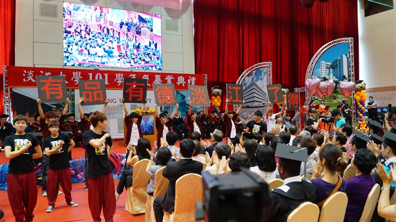 又見鳳凰花開、驪歌輕唱的時節!本校101學年度畢業典禮於6月15日(星期六)在淡水校園紹謨紀念體育館舉行。典禮前,於上午9時先進行了「校園巡禮」,師長們引領畢業生繞行校園,回顧求學期間校園生活的心情點滴,和來自各地的同學們相識相聚於五虎崗上,將永遠成為畢業生心中最深刻的美麗回憶。典禮於上午10時開始,由校長張家宜主持,並有新北市市長朱立倫、吐瓦魯駐華大使Minute Alapati TAUPO夫婦、史瓦濟蘭王國大使H.E Mrs. Njabuliso B. Gwebu 等貴賓親臨典禮會場祝賀。
