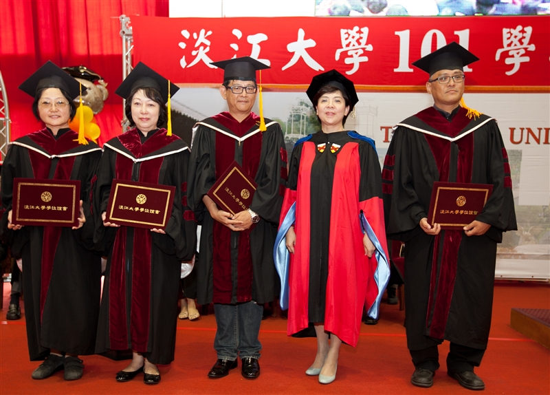 又見鳳凰花開、驪歌輕唱的時節!本校101學年度畢業典禮於6月15日(星期六)在淡水校園紹謨紀念體育館舉行。典禮前,於上午9時先進行了「校園巡禮」,師長們引領畢業生繞行校園,回顧求學期間校園生活的心情點滴,和來自各地的同學們相識相聚於五虎崗上,將永遠成為畢業生心中最深刻的美麗回憶。典禮於上午10時開始,由校長張家宜主持,並有新北市市長朱立倫、吐瓦魯駐華大使Minute Alapati TAUPO夫婦、史瓦濟蘭王國大使H.E Mrs. Njabuliso B. Gwebu 等貴賓親臨典禮會場祝賀。