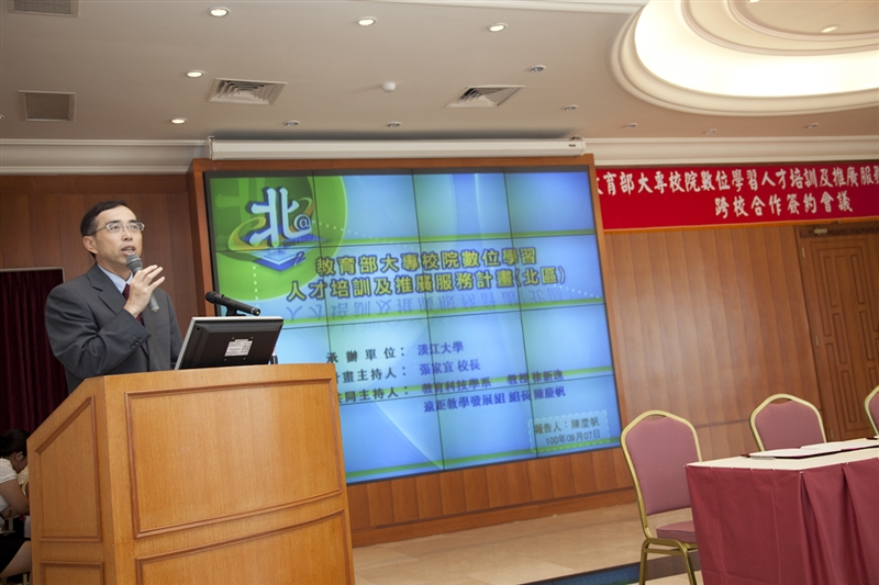 本校遠距教學發展組陳慶帆組長進行「教育部大專校院數位學習人才培訓及推廣服務計畫(北區)」簡報。
