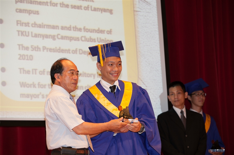 蘭陽校園90%以上的課程採英語授課,各屆畢業典禮皆全程以英語進行,畢業典禮由張校長主持,蒞臨的貴賓有:馬紹爾群島共和國菲利浦.卡布亞(Phillip Kabua)大使暨夫人、參議員Jeban Riklon,宜蘭縣政府計畫處周慶安處長代表縣長出席,礁溪鄉長林錫忠先生等。張校長以「有品有德.淡江了得」期勉畢業同學需具備:品德倫理、獨立思考、樂活健康、團隊合作、美學涵養、全球視野、資訊運用、洞悉未來等八大基本素養,希望大家能夠保持淡江人的特質,貢獻世界。宜蘭縣政府計畫處長、礁溪鄉長均上台勉勵,給予同學莫大的啓發與祝福。