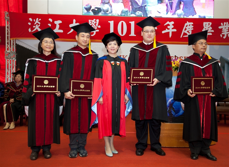 又見鳳凰花開、驪歌輕唱的時節!本校101學年度畢業典禮於6月15日(星期六)在淡水校園紹謨紀念體育館舉行。典禮前,於上午9時先進行了「校園巡禮」,師長們引領畢業生繞行校園,回顧求學期間校園生活的心情點滴,和來自各地的同學們相識相聚於五虎崗上,將永遠成為畢業生心中最深刻的美麗回憶。典禮於上午10時開始,由校長張家宜主持,並有新北市市長朱立倫、吐瓦魯駐華大使Minute Alapati TAUPO夫婦、史瓦濟蘭王國大使H.E Mrs. Njabuliso B. Gwebu 等貴賓親臨典禮會場祝賀。