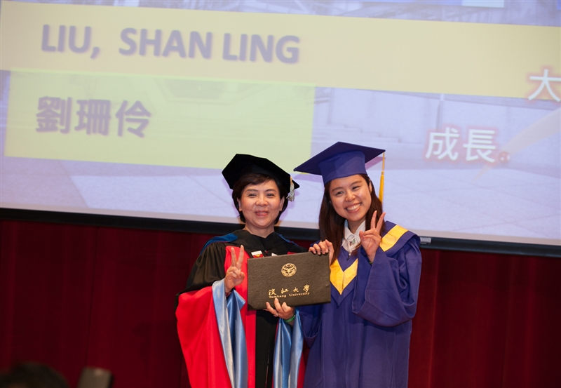 蘭陽校園90%以上的課程採英語授課,各屆畢業典禮皆全程以英語進行,畢業典禮由張校長主持,蒞臨的貴賓有:馬紹爾群島共和國菲利浦.卡布亞(Phillip Kabua)大使暨夫人、參議員Jeban Riklon,宜蘭縣政府計畫處周慶安處長代表縣長出席,礁溪鄉長林錫忠先生等。張校長以「有品有德.淡江了得」期勉畢業同學需具備:品德倫理、獨立思考、樂活健康、團隊合作、美學涵養、全球視野、資訊運用、洞悉未來等八大基本素養,希望大家能夠保持淡江人的特質,貢獻世界。宜蘭縣政府計畫處長、礁溪鄉長均上台勉勵,給予同學莫大的啓發與祝福。
