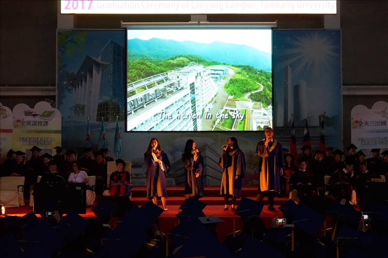 最後依照蘭陽校園的傳統,全體畢業生一齊高唱蘭陽之歌“Proud of You ”,由搖滾社4位同學到台上領唱,為自己四年來的勇敢築夢喝彩,也為迎向未來燦爛的前程而鼓舞。典禮漸漸進入尾聲,在回顧蘭陽“Unforgettable Memory”的剪輯影片中,噙著淚水看著影片中每位同學歡樂的身影,就在捨不得離開蘭陽的氛圍中禮成,畢業生帶著全校師長及學弟妹的祝福,昂首開展人生新的里程碑。