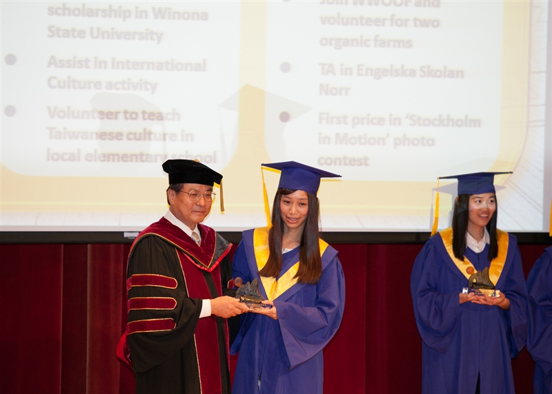 蘭陽校園的「青出於蘭」畢業奬,有如奧斯卡頒奬般令人期待,今年頒發學分奬、國際奬、領袖奬、傑出奬等4項畢業奬,學分奬以學生在校修習學分最多且成績優良者,入圍的有6位,得奬的是英美語言文化學系姚怡琳同學;國際奬以大三出國期間修習成績優良、英文能力及在外參與活動的表現來評選,入圍的有6位,獲奬有3名,分別是英美語言文化學系欒婷婷同學、彭子昕同學,及國際觀光管理學系吳玠儒同學;領袖奬由系(組)各推薦2名學生,以在校領導社團或學會表現優良者,入圍的有8位,獲奬有2名,分別是資訊創新與科技學系林柏鈞同學及全球政治經濟學系陳彥甫同學;傑出奬由各系推薦1名,共3名參與角逐,由師生網路票選及候選人1分鐘的自薦後,由評選委員投票產生,獲奬的是國際觀光管理學系謝鈞翔同學。