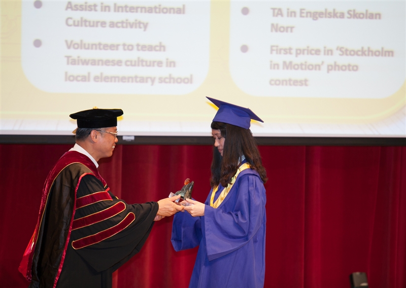 蘭陽校園的「青出於蘭」畢業奬,有如奧斯卡頒奬般令人期待,今年頒發學分奬、國際奬、領袖奬、傑出奬等4項畢業奬,學分奬以學生在校修習學分最多且成績優良者,入圍的有6位,得奬的是英美語言文化學系姚怡琳同學;國際奬以大三出國期間修習成績優良、英文能力及在外參與活動的表現來評選,入圍的有6位,獲奬有3名,分別是英美語言文化學系欒婷婷同學、彭子昕同學,及國際觀光管理學系吳玠儒同學;領袖奬由系(組)各推薦2名學生,以在校領導社團或學會表現優良者,入圍的有8位,獲奬有2名,分別是資訊創新與科技學系林柏鈞同學及全球政治經濟學系陳彥甫同學;傑出奬由各系推薦1名,共3名參與角逐,由師生網路票選及候選人1分鐘的自薦後,由評選委員投票產生,獲奬的是國際觀光管理學系謝鈞翔同學。