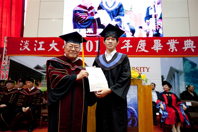 又見鳳凰花開、驪歌輕唱的時節!本校101學年度畢業典禮於6月15日(星期六)在淡水校園紹謨紀念體育館舉行。典禮前,於上午9時先進行了「校園巡禮」,師長們引領畢業生繞行校園,回顧求學期間校園生活的心情點滴,和來自各地的同學們相識相聚於五虎崗上,將永遠成為畢業生心中最深刻的美麗回憶。典禮於上午10時開始,由校長張家宜主持,並有新北市市長朱立倫、吐瓦魯駐華大使Minute Alapati TAUPO夫婦、史瓦濟蘭王國大使H.E Mrs. Njabuliso B. Gwebu 等貴賓親臨典禮會場祝賀。